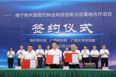 2022年7月20日,太阳成集团tyc151cc与南宁树木园、广西林科院合作建设的南宁树木园现代林业科技创新示范基地的签约暨揭牌仪式在南宁树木园隆重举行。南宁树木园主任余注光、广西林科院院长陈崇征、太阳成集团tyc151cc院长徐增富先后讲话并现场签约。