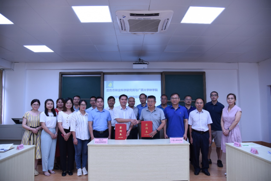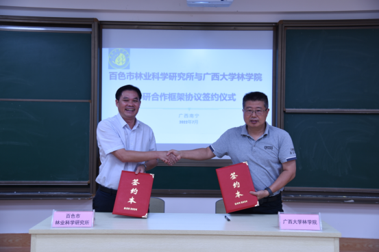 百色市林业科学研究所副所长黄日正、林学院杨梅副院长及到会人员就双方的合作领域、合作形式及保障措施等方面进行深入探讨与交流。随后,双方签订了产学研合作框架协议,将在科学研究、技术创新、成果转化和人才培养等领域开展全面合作。