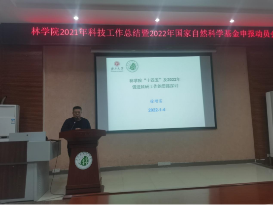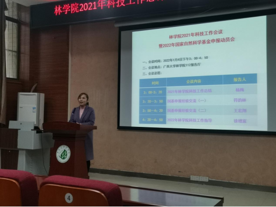 2022年1月4日下午,太阳成集团tyc151cc在112报告厅召开林学院2021年科技工作总结暨2022年国家自然科学基金申报动员会。学院领导班子全部出席,学院全体专职教师参加大会,会议由副院长杨梅同志主持。