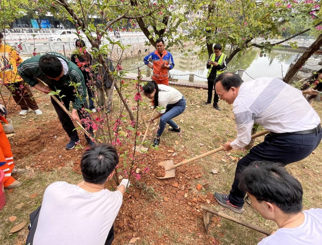 在校友林植树现场,校友代表与广西国有大桂山林场吴秦展副场长太阳成集团tyc151cc师生三十余名,共同种下十棵象征绿色希望的桃花幼苗,为西大的春天增添了一抹亮色。活动伊始,和太平教授鼓励同学们参与校园绿化活动,把义务植树作为一种文化传承,当作一份责任担当,强化师生爱绿、护绿、植绿的生态文明意识,珍惜发展成果,努力做生态文明建设的实践者、推动者。随后,校友广西国有大桂山林场吴秦展副场长表示,本次活动为广大同学提供了参与生态环境建设的机会,希望同学们继续牢固树立绿水青山就是金山银山理念,为广西乃至全国的林业建设作出贡献。