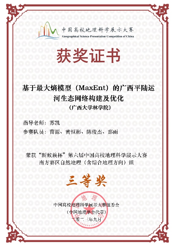 由苏凯老师指导的作品“基于最大熵模型(MaxEnt)的广西平陆运河生态网络构建及优化“(参赛学生:曹源、黄恒彬、陈俊杰、那雨)获“新蚁族杯”第六届中国高校地理科学展示大赛南方赛区自然地理组三等奖。