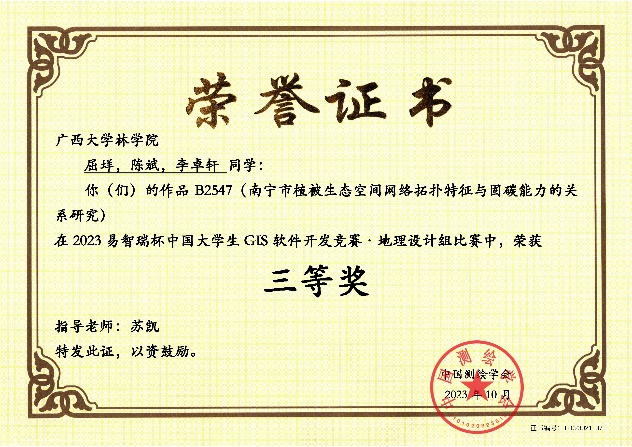 苏凯老师指导的作品“南宁市植被生态空间网络拓扑特征与固碳能力的关系研究”(参赛学生:屈垟、陈斌、李卓轩)和“平陆运河全周期建设对野生动物栖息地连通性网络的影响研究“(参赛学生:曹源、黄恒彬、陈俊杰、那雨)获GIS应用开发组三等奖。