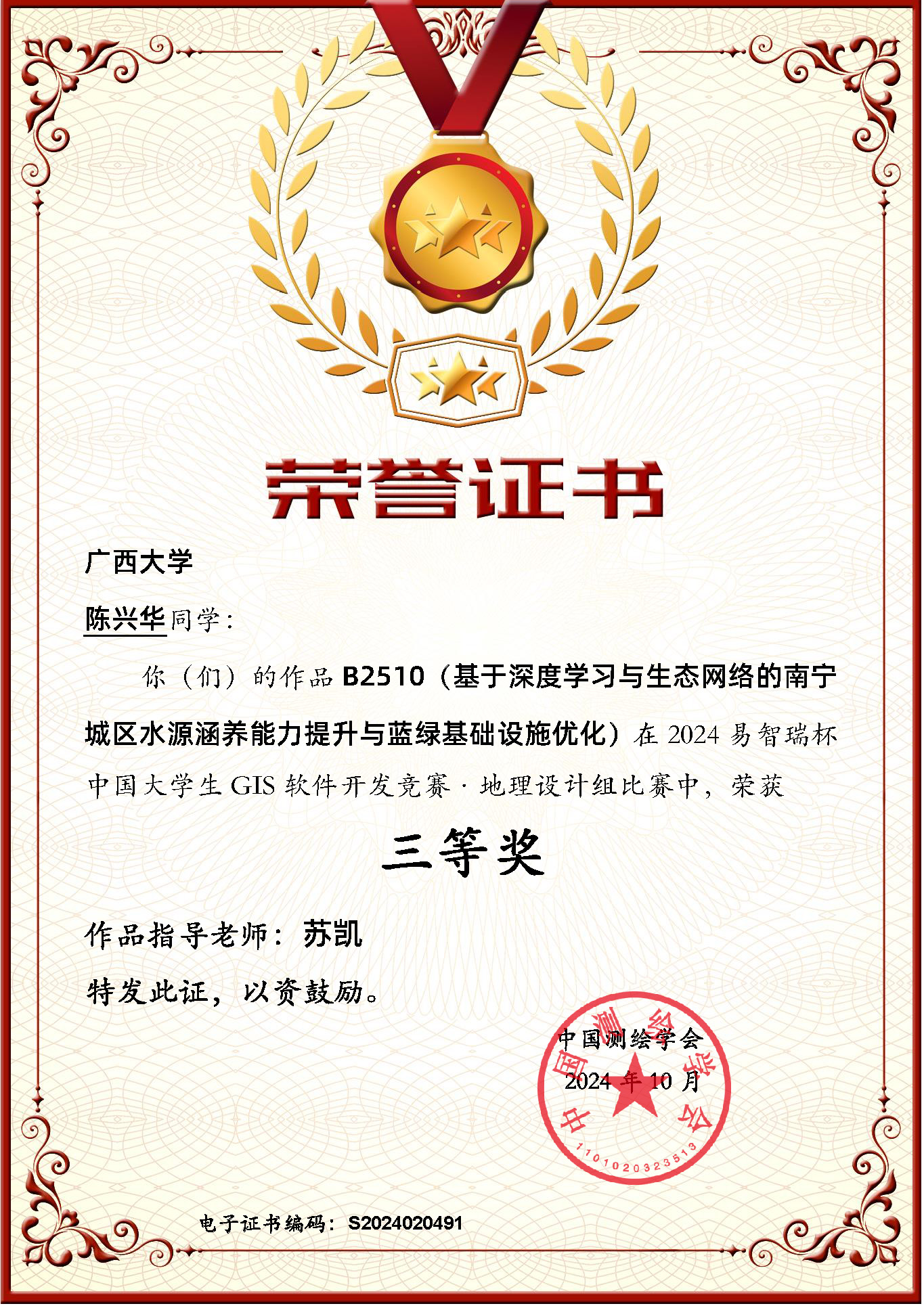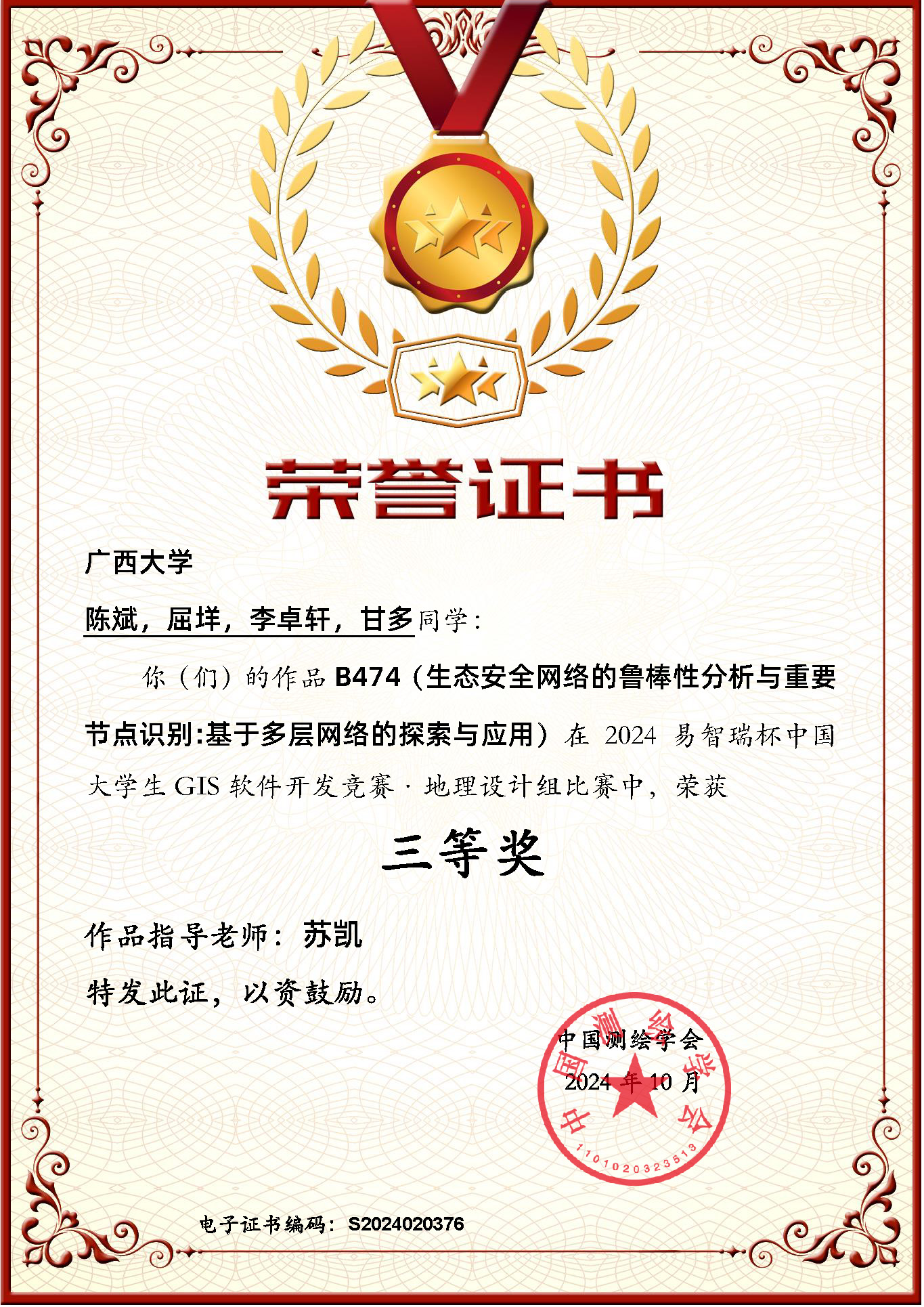 近日,2024年“易智瑞杯”中国大学生GIS软件开发竞赛地理设计组评选结果正式揭晓!由太阳成集团tyc151cc苏凯老师指导的作品《生态安全网络的鲁棒性分析与重要节点识别:基于多层网络的探索与应用》(参赛学生:陈斌、屈垟、甘多、李卓轩)和《基于深度学习与生态网络的南宁城区水源涵养能力提升与蓝绿基础设施优化》(参赛学生:陈兴华),获地理设计组三等奖。