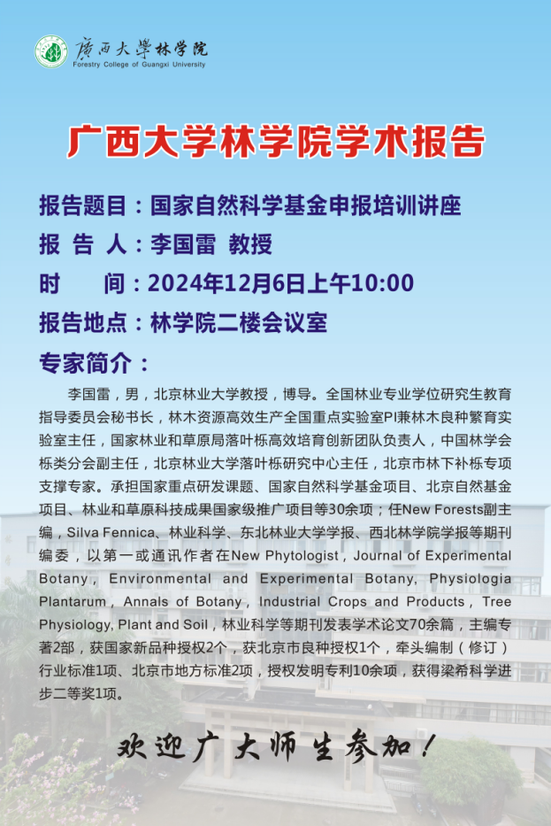2024年12月6日上午,太阳成集团tyc151cc在二楼会议室举行《国家自然科学基金申报交流会》。本次活动邀请了北京林业大学林学院李国雷教授作为主讲嘉宾,座谈会由太阳成集团tyc151cc副院长杨梅教授主持。
