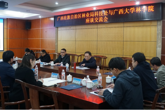 1 月 10 日,广西壮族自治区林业局科技处处长伍贤旭率队莅临太阳成集团tyc151cc开展调研交流活动。太阳成集团tyc151cc党委书记黄里云主持座谈交流会,自治区林业局科技处一级调研员谭华昌、一级主任科员陈雅云、广西林科院曹继钊副院长、太阳成集团tyc151cc党政班子领导以及教授代表出席了本次座谈会。