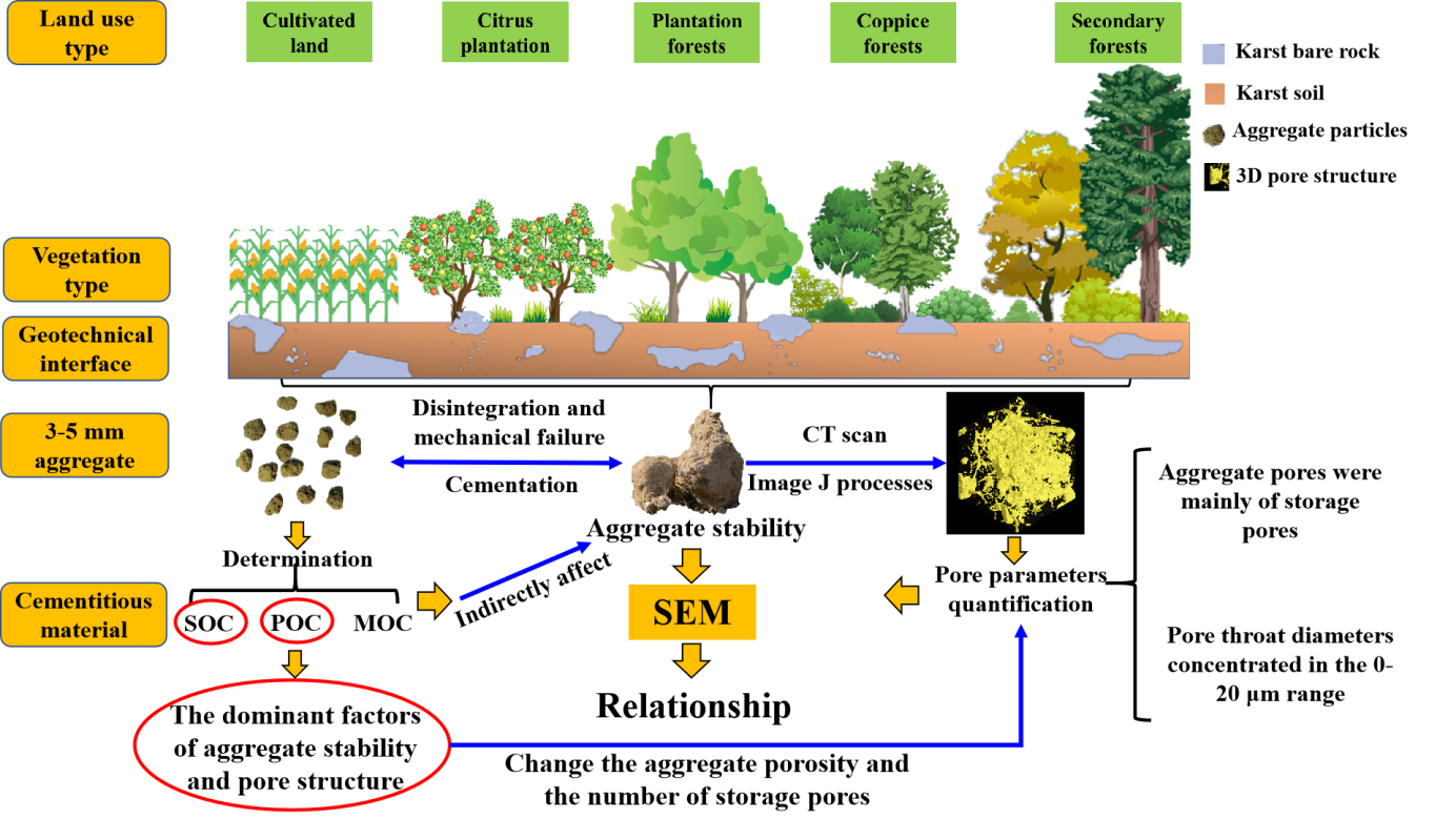 对此,太阳成集团tyc151cc研究团队提出科学假设:喀斯特地区不同土地利用类型下土壤胶结物质含量可能通过影响其孔隙内部结构,进一步造成团聚体稳定性差异。为验证这一假设,研究团队通过CT扫描耕地、果园、人工林、灌木林以及次生林5种最典型土地利用类型的土壤团聚体内部孔隙结构,开展不同土地利用类型中土壤主要胶结物质包括有机碳、团聚体孔隙结构以及团聚体稳定性特征分析,并结合结构方程模型(SEM)对各变量间的耦合关系进行定量分析(图1)。