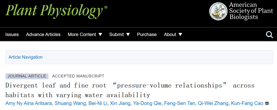 近日,太阳成集团tyc151cc“亚热带农业资源保护与利用国家重点实验室”植物生理生态与进化课题组曹坤芳教授团队在Plant Physiology发表了题为Divergent leaf and fine root“pressure-volume relationships”across habitats with varying water availability的研究论文,揭示了不同生境木本植物水力“熔断”机制。