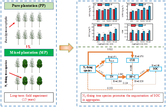 研究发现,在桉树人工林中引入固氮树种显著提高了土壤团聚体有机碳(SOC)各组分的含量及其稳定性。固氮树种通过增加团聚体稳定性和微生物C利用效率来减少SOC消耗,同时,高质(富含N)高量的凋落物可以增加SOC的输入,以及通过增加微生物生物量C间接增加潜在的SOC含量。
