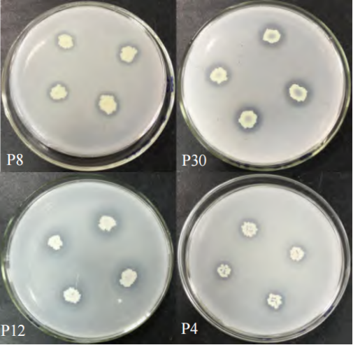 研究结果表明:从3个不同林龄(1、2和41年)望天树人工林根际共分离筛选出18株溶磷菌,其中溶磷能力较强菌株为P4、P8、P12和P30;结合各菌株的菌落特征、生理生化特征、16S rDNA序列的比对结果和系统发育树的分析,将P4菌株和P12菌株鉴定为洋葱伯克霍尔德菌(Burkholderia cepacia),P8菌株为唐菖蒲伯克霍尔德菌(Burkholderia gladioli),P30菌株为蜡状芽孢杆菌(Bacillus cereus)。4株溶磷菌株在30~35℃,pH为5.5~8.5,NaCl质量分数为0~2.5%时均具有良好的溶磷能力,对磷酸铝和磷酸铁的溶磷量均达300 mg/L,菌株对温度和pH的耐受性较广,在南方酸性土壤具有较大的应用潜力,有望作为望天树专用溶磷菌肥研制的优质菌株。筛选得到的4株高效溶磷菌具有良好的溶磷能力,且能够溶解多种难溶性无机磷酸盐,可用于望天树专用微生物肥料的研发,具有良好的应用潜力。(该研究结果以“望天树人工林根际溶磷细菌的筛选及溶磷特性”为题发表在《北京林业大学学报》,2020级硕士研究生韦双为该论文的第一作者,杨梅教授为通讯作者。该研究获得国家自然科学基金项目(31960307),以及广西自然科学基金项目(2018GXNSFAA28110)共同资助)。
