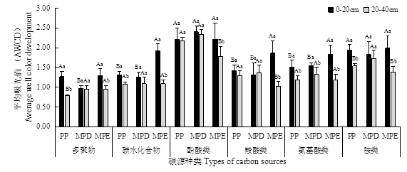 图4不同望天树林型下土壤微生物群落对6类碳源的利用特征