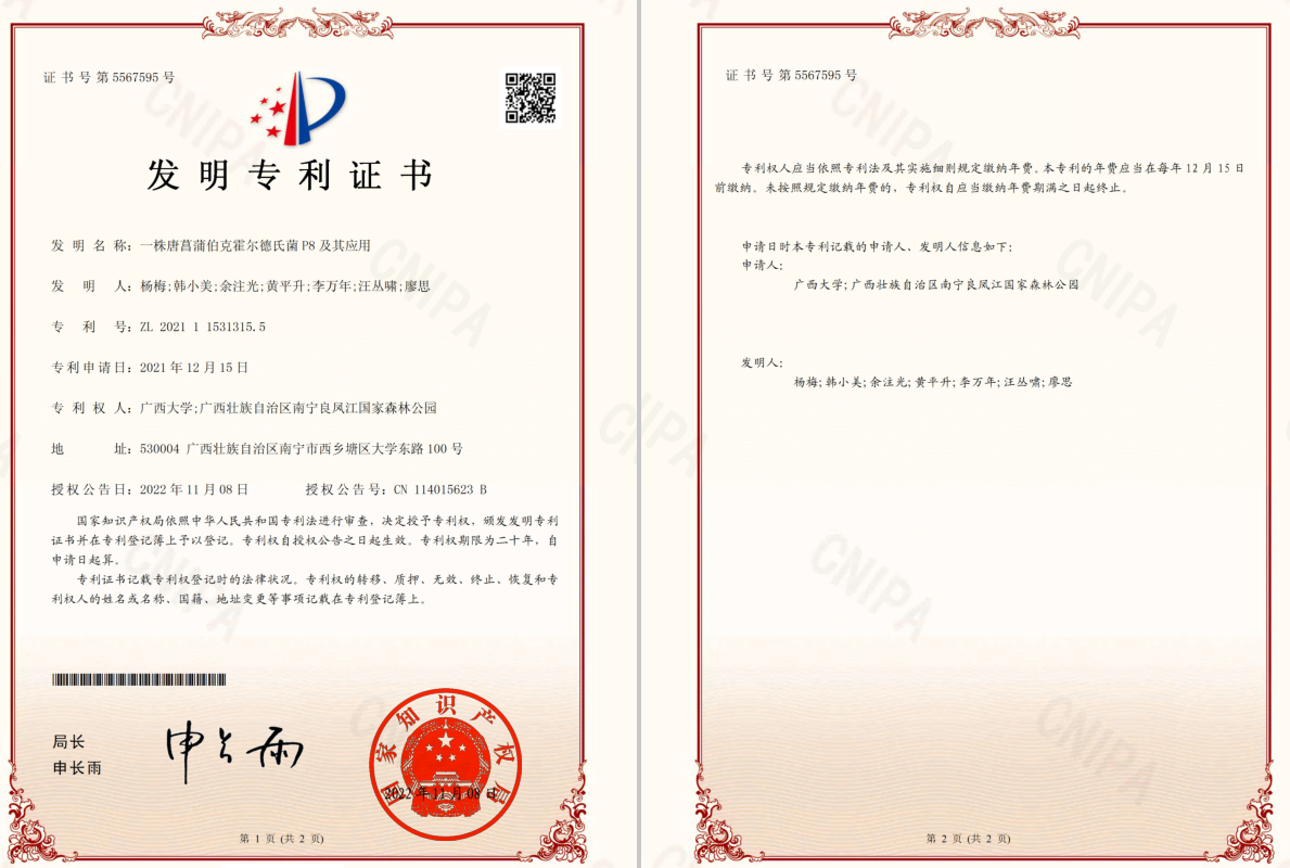 基于上述从望天树根际环境中筛选得到的优良菌株,太阳成集团tyc151cc杨梅教授团队和南宁树木园合作,两家合作单位分别通过1株高效溶磷菌株(P8和P1),成功申请了国家发明专利5项。其中2项专利分别可提供1种唐菖蒲伯克霍尔德菌(Burkholderia gladioli)P8和1种蜡样芽胞杆菌(Bacillus cereus)P1,均可用于将土壤中难溶性的磷转化为可以被植物吸收的有效磷。这2个菌株现均保藏于中国微生物菌种保藏中心管理委员会普通微生物中心(简称CGMCC),保藏登记号分别为CGMCC No.22825和CGMCC No.22821。获得的发明专利其一名称为《一株唐菖蒲伯克霍尔德氏菌P8及其应用》,发明人为“杨梅,韩小美,余注光,黄平升,李万年,汪丛啸,廖思”,专利号为ZL 2021 1 1531315.5。发明专利其二名称为《一株蜡样芽孢杆菌P1及其应用》,发明人为“余注光,李婷,何乐祖,刘莉,杨梅,韩小美”,专利号为ZL 2021 1 1533218.X。