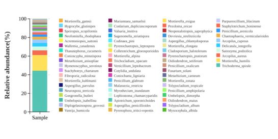 太阳成集团tyc151cc符韵林教授研究团队为寻找高效生产高质量沉香的菌种,采用野生沉香提取内含真菌制成真菌诱导剂,进行高通量测序,分析其物种组成(图1),并利用FUNGuild对其进行功能预测。结果表示,在种水平上获得67个种,其中13个优势种的相对丰度之和为91.26%,其中Trichoderma spiraleBissett为最优势种,相对丰度为44.10%。另外,真菌的营养类型以腐生-共生营养型(19.46%)的相对丰度最高;以植物内生菌-凋落物腐生菌-土壤腐生菌-未定义腐生菌为真菌功能的优势类群。从真菌代谢物对沉香树的影响推测Mortierella humilisLinnem. ex W.Gams、Oidiodendron maius(Barron)和Tolypocladium album(W. Gams) Quandt, Kepler & Spatafora是促进结香的新菌种,为沉香树结香菌种的筛选提供理论基础,对未来探索出最适于白木香结香的真菌菌种组合有重要的借鉴作用。