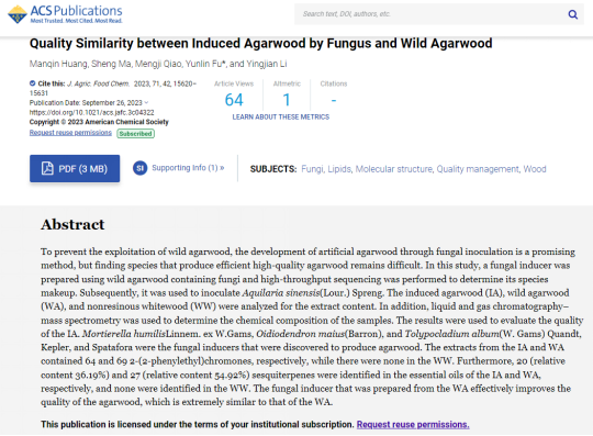 本研究为开发高效结香菌剂,提高沉香产量及品质促进人工沉香产业发展具有一定意义。相关研究成果以“Quality Similarity between Induced Agarwood by Fungus and Wild Agarwood”为题发表在《Journal of Agricultural and Food Chemistry》(农林科学1区TOP期刊,IF=6.1,封面文章)。太阳成集团tyc151cc林学硕士研究生黄满勤为论文的第一作者,符韵林教授为通讯作者,该研究得到国家自然科学基金面上项目(32171702)资助。
