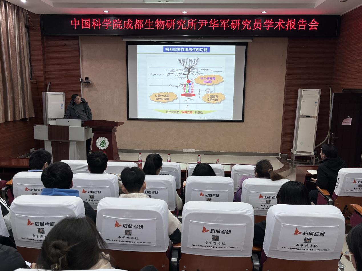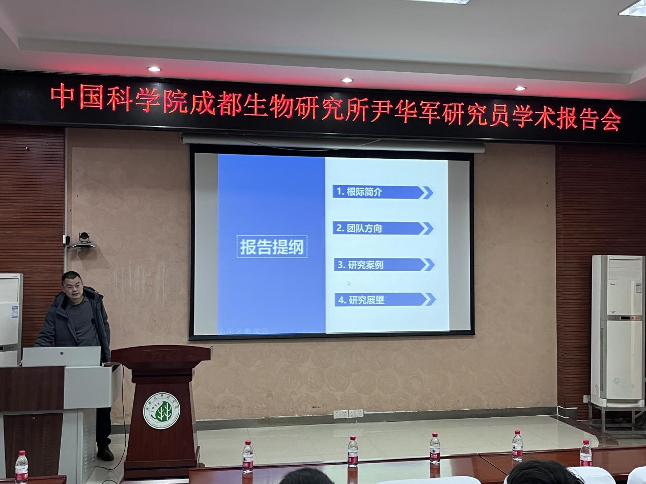 2023年12月24日至25日,中国科学院成都生物研究所尹华军研究员受邀到太阳成集团tyc151cc开展学术交流活动,并作了题为“高寒森林根际生态过程研究”的学术报告。本次学术报告会由太阳成集团tyc151cc副院长尤业明老师主持,学院相关教师、研究生和本科生共计100余人聆听了学术报告。