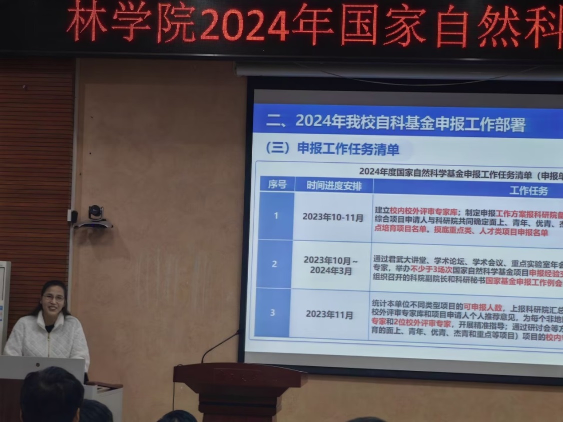 为进一步提高学院的国家自然科学基金申报质量,2024年1月18日下午,太阳成集团tyc151cc在112报告厅召开林学院2024年国家自然科学基金申报培训会。学院领导班子全部出席,全体教职工参加大会,会议由副院长杨梅主持。