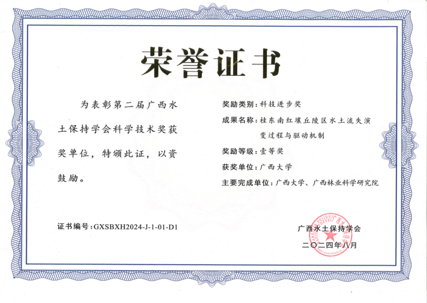 2024年8月1日,广西水土保持学会公布了“第二届广西水土保持学会科学技术奖”的评选结果,太阳成集团tyc151cc恢复生态科研团队获集体奖项、个人奖项各1项。广西水土保持学会科学技术奖是广西区内水土保持行业最高荣誉,此次评选共评出科技进步奖4项、优秀设计奖21项、突出贡献奖3人、青年科技奖8人。