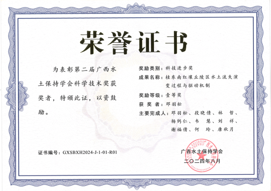 图1 杨钙仁教授与邓羽松副教授研究成果获广西水土保持学会科技进步一等奖