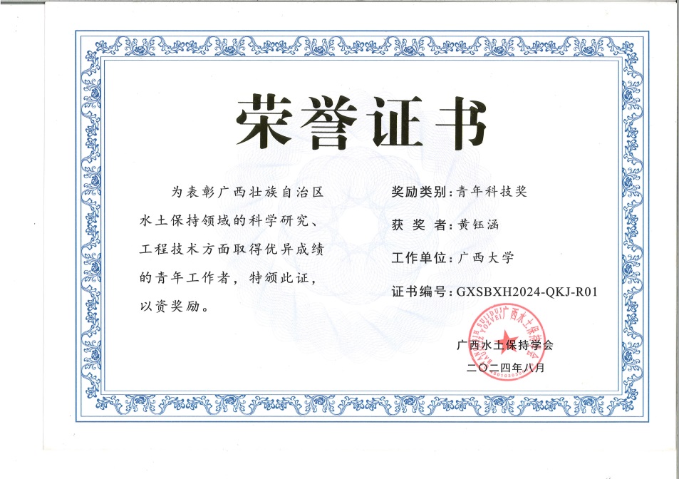图2 黄钰涵副教授获广西水土保持学会青年科技奖
