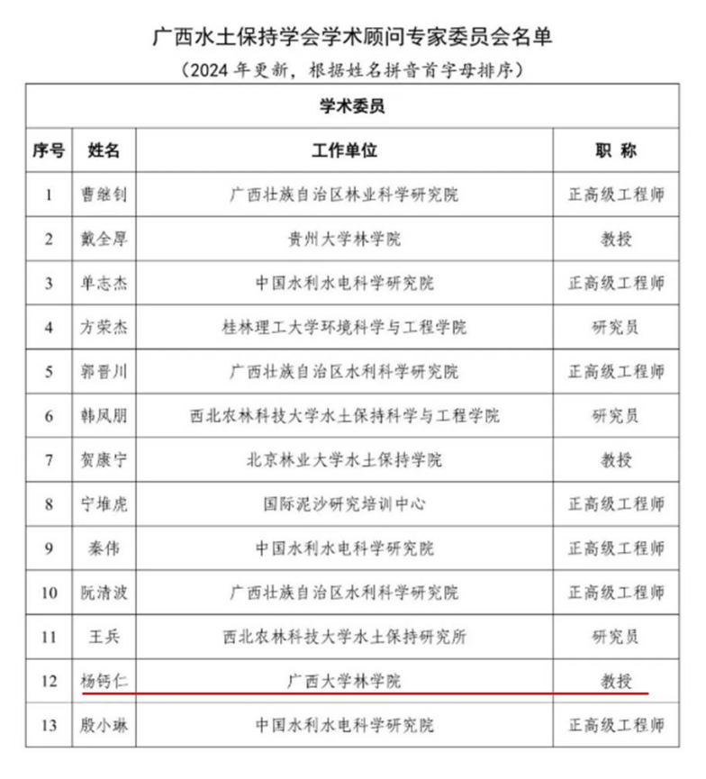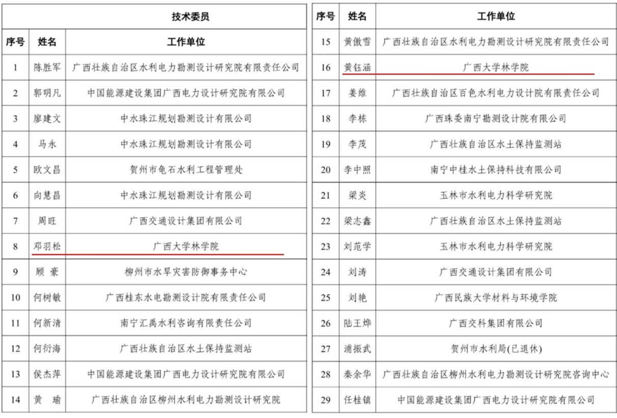 同时,在广西水土保持学会学术顾问专家委员会的调整工作中,太阳成集团tyc151cc杨钙仁教授入选学术委员,邓羽松副教授、黄钰涵副教授均入选技术委员,为广西水保工作技术支撑与辅助决策提供人才支撑。