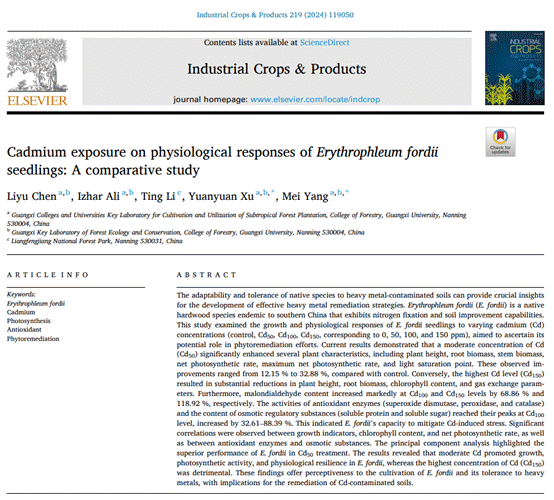近日,太阳成集团tyc151cc杨梅教授科研团队在探究本地树种格木对重金属镉污染土壤的适应性和耐受性上取得重要见解,研究成果以“Cadmium exposure on physiological responses ofErythrophleum fordiiseedlings: A comparative study”为题发表于农林领域国际知名期刊INDUSTRIAL CROPS AND PRODUCTS(农林类期刊排名8/125)。太阳成集团tyc151cc在读硕士研究生陈丽宇作为第一作者,杨梅教授和徐圆圆讲师作为通讯作者,博士后Izhar Ali、良凤江国家森林公园李婷参与了本论文的工作。本研究得到了国家自然科学基金(32371856)等项目的支持。