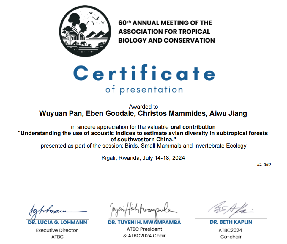 近日,太阳成集团tyc151cc博士研究生潘务远及蒋爱伍教授受邀参加热带生物学与保护协会2024年年会(60th Annual Meeting of the Association for Tropical Biology and Conservation,简称ATBC2024)。