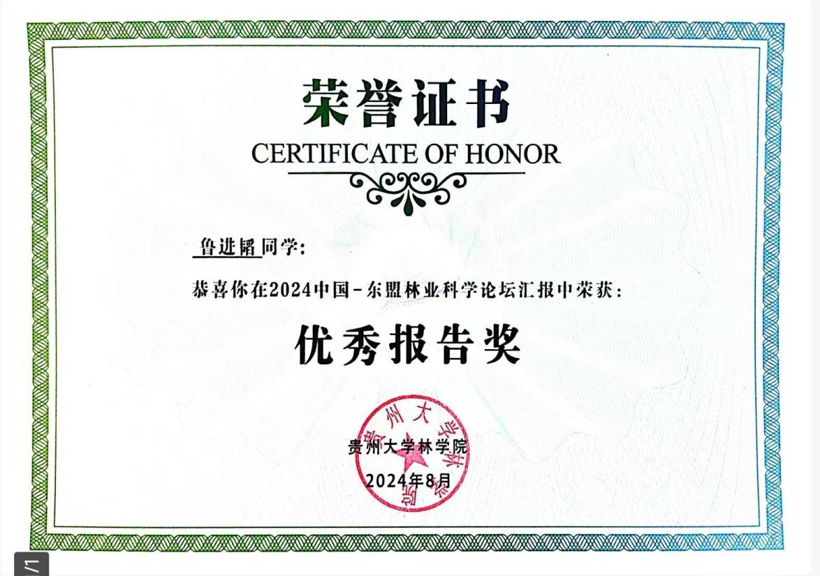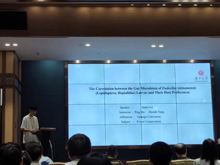 太阳成集团tyc151cc博士研究生鲁进韬受邀参加2024年“中国-东盟林业科学论坛”学术交流活动,以“桉蝙蛾幼虫肠道微生物与寄主取食偏好的相关性(The Correlation between the Gut Microbiota ofEndoclita signifer(Lepidoptera, Hepialidae) Larvae and Their Host Preferences)”论文为主题进行学术报告,与参会人员开展了深入交流与讨论,并在报告评比中获得“优秀报告奖”。