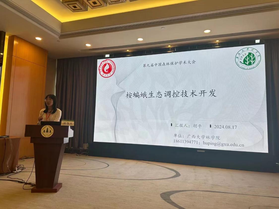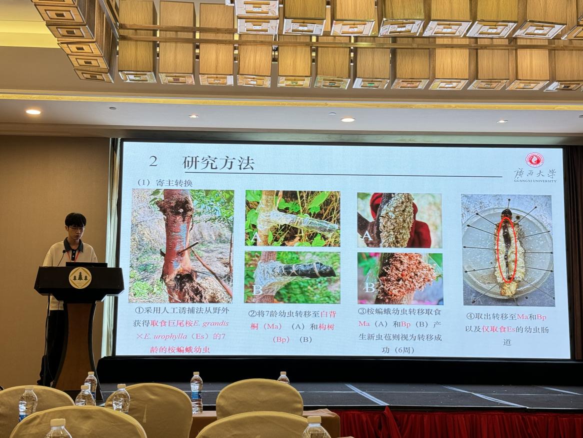 大会以“森林保护科技创新赋能新质生产力发展”为主题,吸引了来自全国各地的700余名高校、科研院所的专家学者参与。林学院森林保护团队的杨振德教授与胡平副教授带领团队成员参加了此次大会。胡平副教授在大会上作了题为“桉蝙蛾综合防控技术开发”的学术报告,其创新性的研究方法和实践成果,尤其是昆虫灯诱新方法受到了与会专家的高度评价和热烈讨论。此外,博士生周乐明、鲁进韬以及硕士生刘佳欣在森林昆虫分会场的青年学术沙龙中,分别就“桉树枝瘿姬小蜂体内细菌对宿主寿命及酶活性的影响”、“桉蝙蛾肠道微生物多样性与寄主选择的适应性”以及“桉蝙蛾Endoclita vietnamensis味刷的形态学和组织学观察”做了现场分会场的学术报告,都获得了“第九届中国森林保护学术大会做专题学术报告证书”。他们的研究展示了太阳成集团tyc151cc森保团队在森林保护领域的最新研究成果,激发了与会者的广泛兴趣和深入讨论。