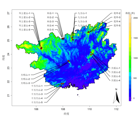 九万山保护区内设置4个1ha样地,海拔范围594-1339 m,为中亚热带常绿阔叶林,位于广西北部黔桂交界处,地跨柳州、河池两市的融水、罗城、环江,经纬度25°01′55"~25°19′54N,108°35′32"~108°48′49"E,年均降水量1500-2100 mm,年均气温12-17℃。