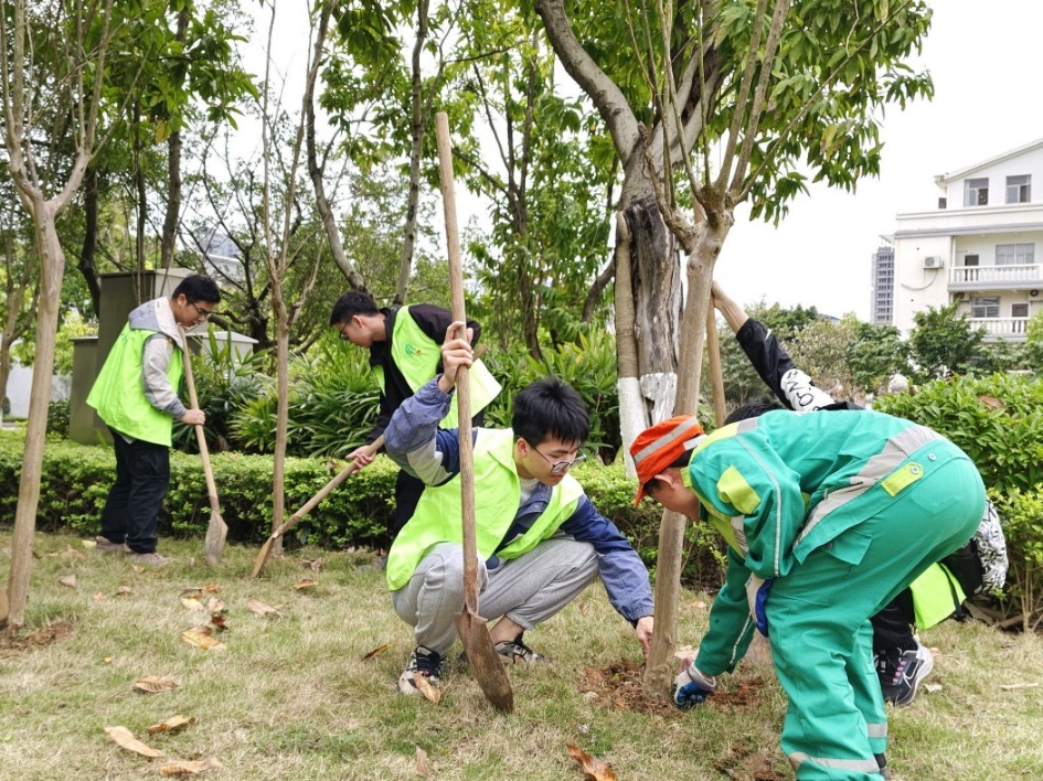 随后,党员们来到汇学堂西侧草地。在学校后勤基建处、博世科物业服务中心绿化技术人员的指导下,党员们纷纷扛起锄头,拿着铁铲,进行落叶清扫、杂草清除、松土施肥等工作。经过一个多小时的努力,整片绿地愈发整洁美观,为校园春色增添生机。