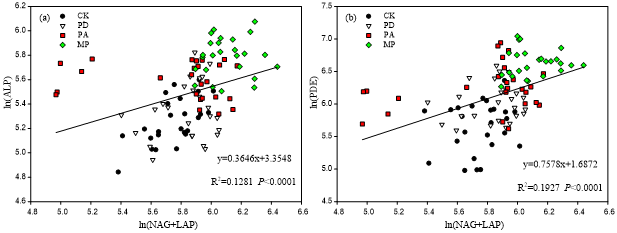 鉴于此,太阳成集团tyc151cc研究团队选取广西南宁市马山县典型石漠化山区经过长期植被恢复的降香黄檀纯林(PD)、顶果木纯林(PA)和降香黄檀/顶果木混交林(MP)三种林分作为研究对象,并以相邻的天然保留地作为对照(CK),重点探究固氮树种单一和混交种植对石漠化山区表层土壤团聚体有机磷(Po)积累和转化的影响。结果表明,在石漠化山区,引入固氮树种单一或两种树种混交种植,对表层土壤(0-10cm)团聚体的理化性质、Po组分和微生物群落结构以及功能产生不同程度影响,其中两种固氮树种混交种植更能显著提高表层土壤团聚体Po的积累和有效性。Po组分主要受ALP、MBN和AM真菌的影响,在石漠化山区引入固氮树种进行植被恢复主要通过影响SOC、NO3--N、C/P、Actinobacteria和AM真菌,最终影响土壤P的转化。该研究强调了利用固氮树种混交种植对于恢复严重退化的石漠化山区土壤的重要性,该策略可用于提高我国石漠化山区土壤团聚体Po的积累和转化,从而可能有效促进地上植被的恢复和稳定性植物群落的构建。