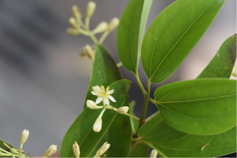 米,树皮光滑,呈灰褐色。其叶片为革质,互生,呈卵形或长椭圆形,表面亮绿,背面淡绿,且有明显的离基三出脉。揉搓叶片,会散发出一股类似肉桂的清香。