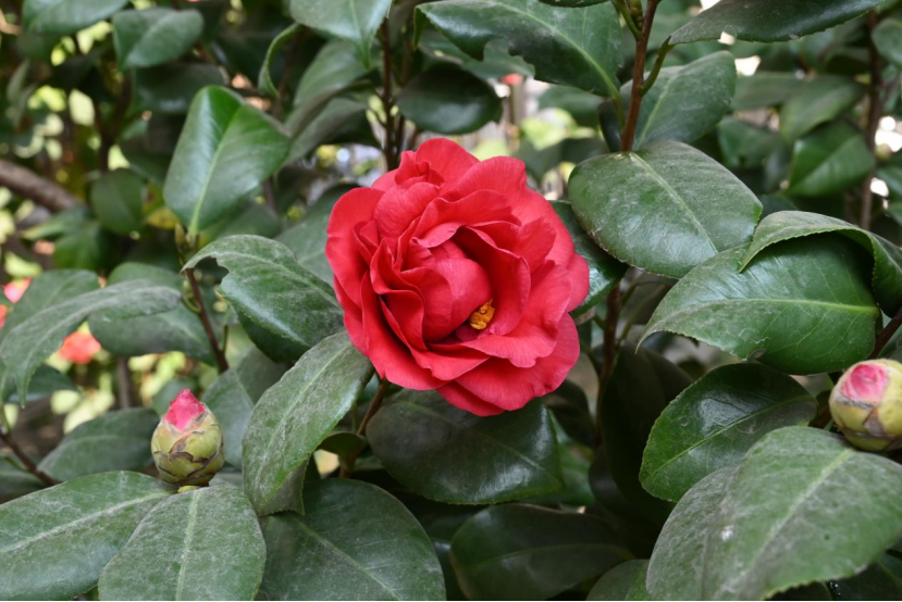山茶树高一般可达9米,树皮呈淡褐色,平滑。叶片为革质,椭圆形,边缘有细锯齿,表面深绿有光泽,背面淡绿。其花朵单生或2-3朵生于枝顶,花色丰富,有红、粉、白等多种颜色,花瓣呈倒卵形,花蕊金黄色,花期较长,从10月至次年5月,尤其在寒冷的冬季,当其他花卉大多凋零时,山茶却傲然绽放,为单调的冬日增添一抹绚丽色彩。