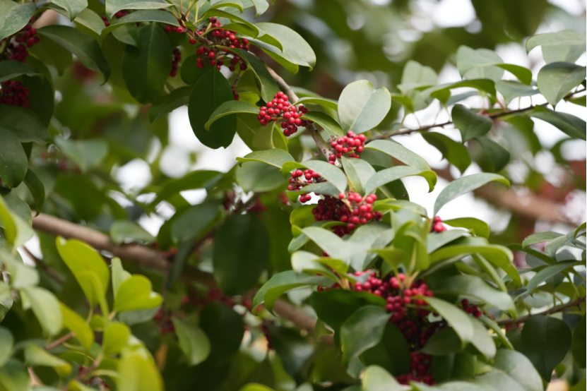 铁冬青在冬季尤其引人注目,其果实为球形,成熟时由青转红,宛如串串红玛瑙挂满枝头,鲜艳夺目,在万物萧索的冬日成为独特景致,吸引众多鸟儿前来觅食,构成和谐的生态画面。
